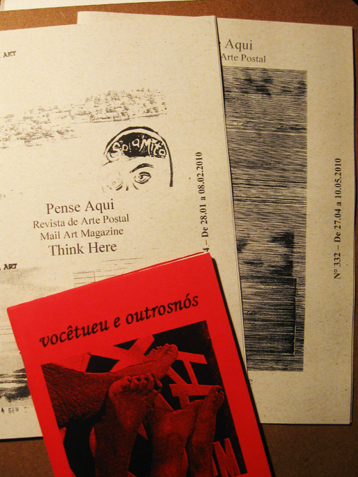 Gozo con gozo como dirían abuelos antes con mi paquete carioca hecho de números de PENSE AQUÍ, revista de Arte Postal que reúne correspondencia artística desde innumerables puntos del planeta hasta Sechiisland y con VOCÊTEU E OUTROSNÓS del que tomamos pizca hace rato allá arriba.