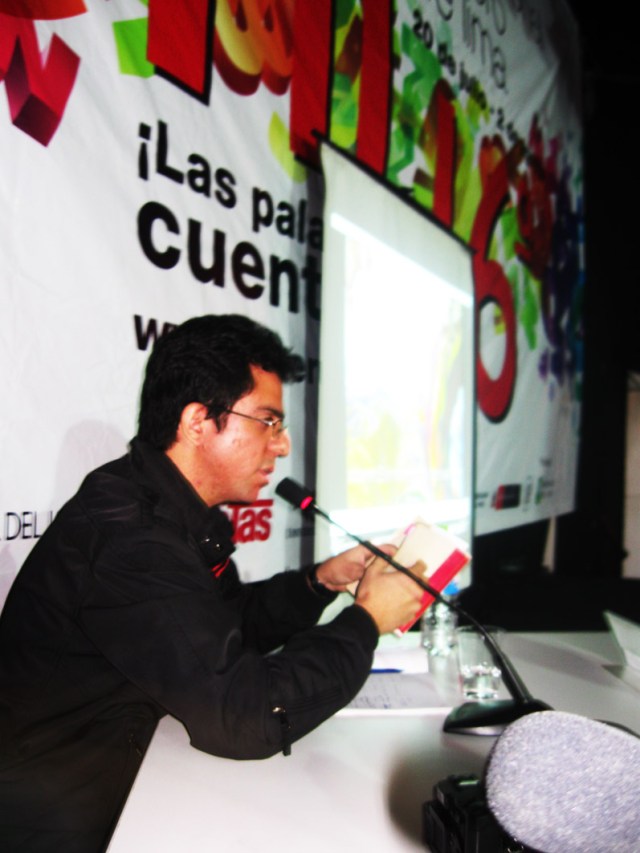 ayer pero hoy todavía, convocados por Luz Vargas y César Romero, un puñado de artistas devolvieron la escritura de Arguedas a la oralidad en la Feria del Libro de Lima. arriba Romero lee Llamado a algunos doctores con la cortina audiovisual de Jesús Ruiz Durand. abajo el zorro Fernando Fernández de Cuatrotablas nos cuenta dramático y dulce -dentro y fuera de su vaso- sobre amores de los dioses y los hombres de Huarochirí.