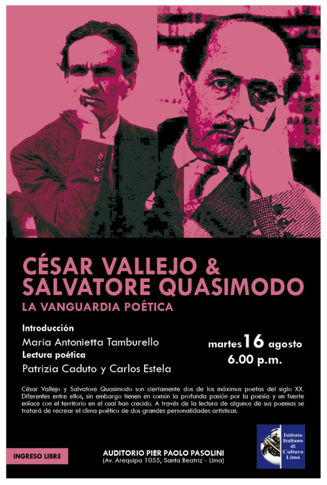 La interpretacion de los poemas de Salvatore Quasimodo estara a cargo de la actriz teatral italiana Patrizia Caduto. El poeta-performer Carlos Estela se encargara de leer los poemas de Cesar Vallejo. Las lecturas estaran acompanadas por imagenes y musicas. Ademas, se proyectaran unos videos con poemas de Cesar Vallejo cantados. Los textos son sacados de distintos poemarios de los dos poetas: Los Heraldos negros y Trilce por Vallejo; Acque e terre (Aguas y tierras), Oboe sommerso (Oboe sumergido), Giorno dopo giorno (Dia tras dia), La vita non è sogno (La vida no es sueno) por Salvatore Quasimodo.