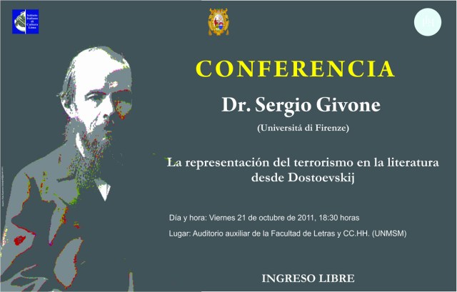 el doctor Sergio Givone, filósofo y novelista italiano, actualmente en Lima, dictará la conferencia La representación del terrorismo en la literatura desde Dostoievski hoy viernes 21 de octubre a las 6:30 pm en el Auditorio auxiliar de la Facultad de Letras y CC.HH. de la UNMSM. El ingreso es libre.