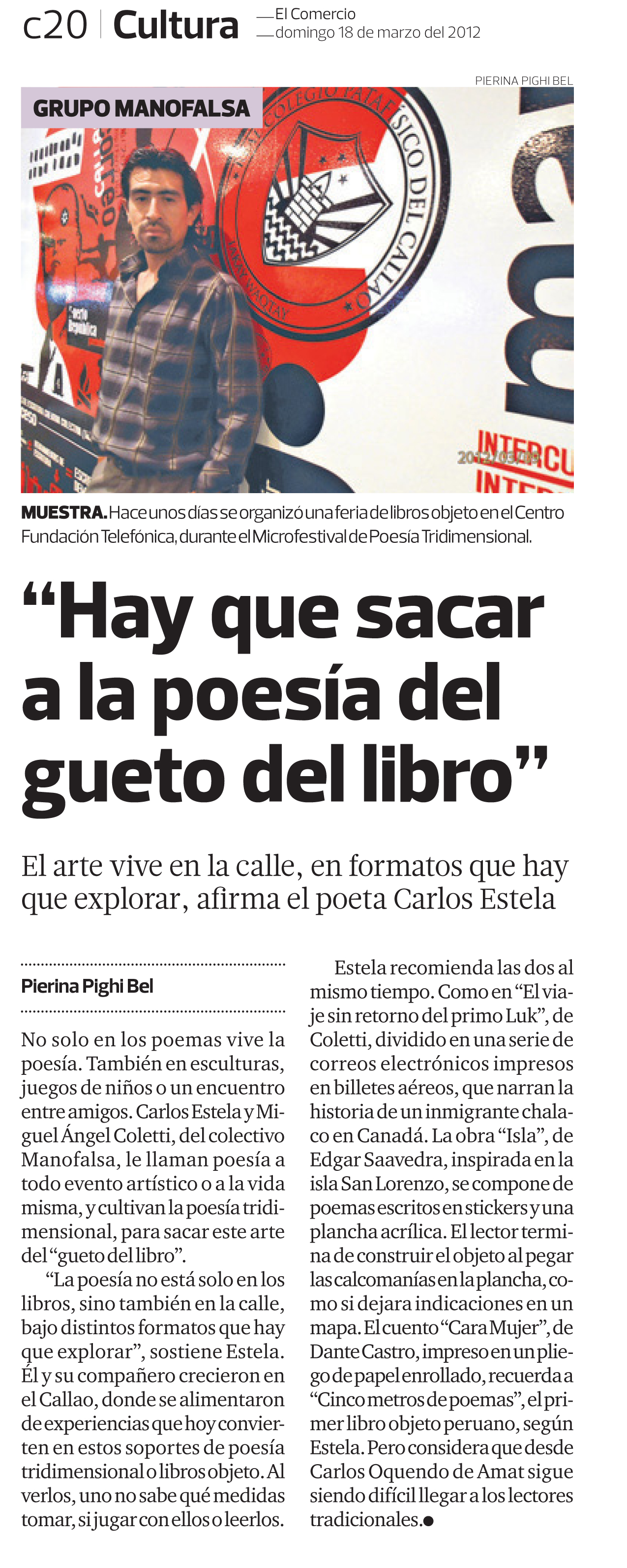 No solo en los poemas vive la poesía. También en esculturas, juegos de niños o un encuentro entre amigos. Carlos Estela y Miguel Ángel Coletti, del colectivo Manofalsa, le llaman poesía a todo evento artístico o a la vida misma, y cultivan la poesía tridimensional, para sacar este arte del “gueto del libro”. “La poesía no está solo en los libros, sino también en la calle, bajo distintos formatos que hay que explorar”, sostiene Estela.