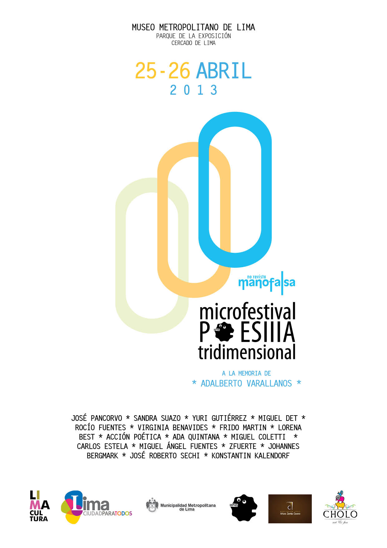 Tercera edición del MicroFestival de Poesía Tridimensional organizado por la no-revista chalaca Manofalsa, que exalta la exploración de nuevos soportes poéticos (poesía visual, poesía sonora, arte correo, slam poetry, grafiti, libro acción, entre otras disciplinas).
